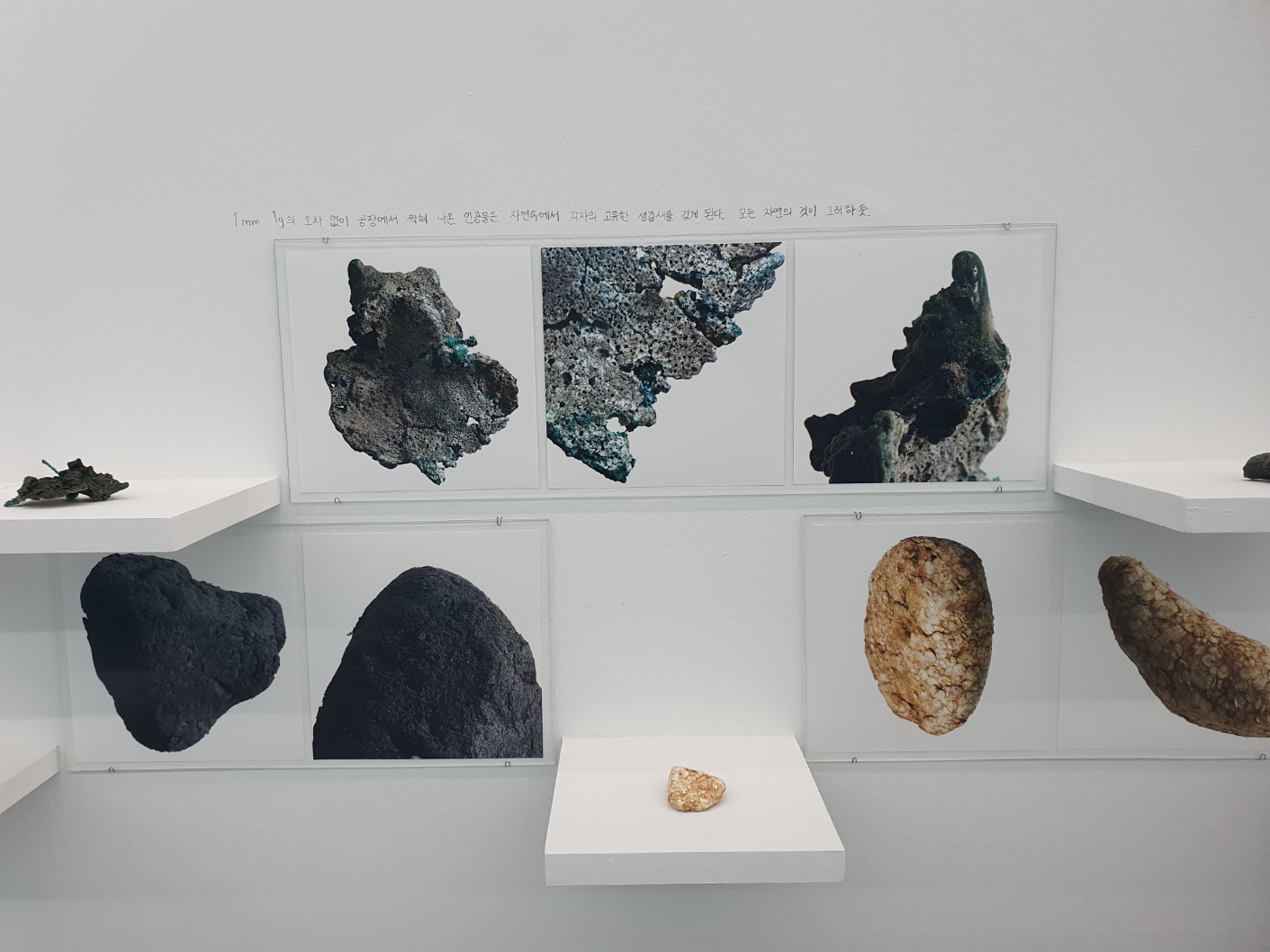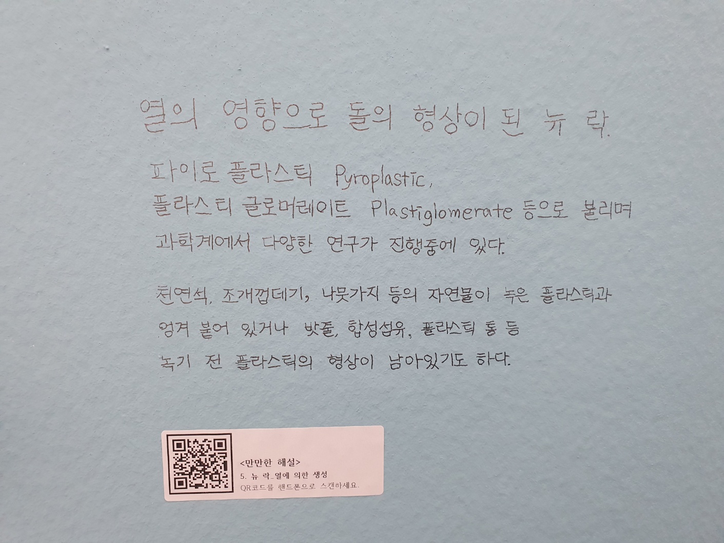 - 자연적인 돌과도 거의 분간이 안되는 뉴락(자연적 풍화로 돌처럼 굳어버린)에도 작은 해양생물이나 개미, 곤충들이 서식하는 것도 볼 수 있었고, 뉴락 전시장에 장한나 작가님의 연필 자필로 씌여진 환경오염의 심각성과 뉴락이 발견된 장소와 일자를 보면서 인간으로 인한 환경오염의 심각성을 다시 한번 깨달을 수 있었습니다.