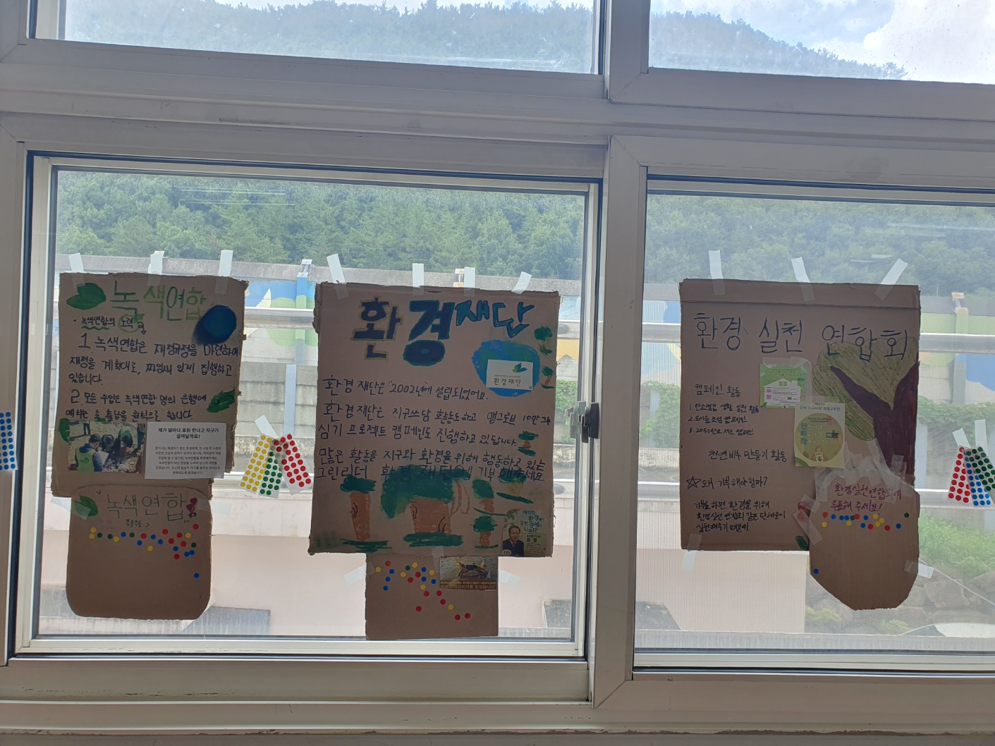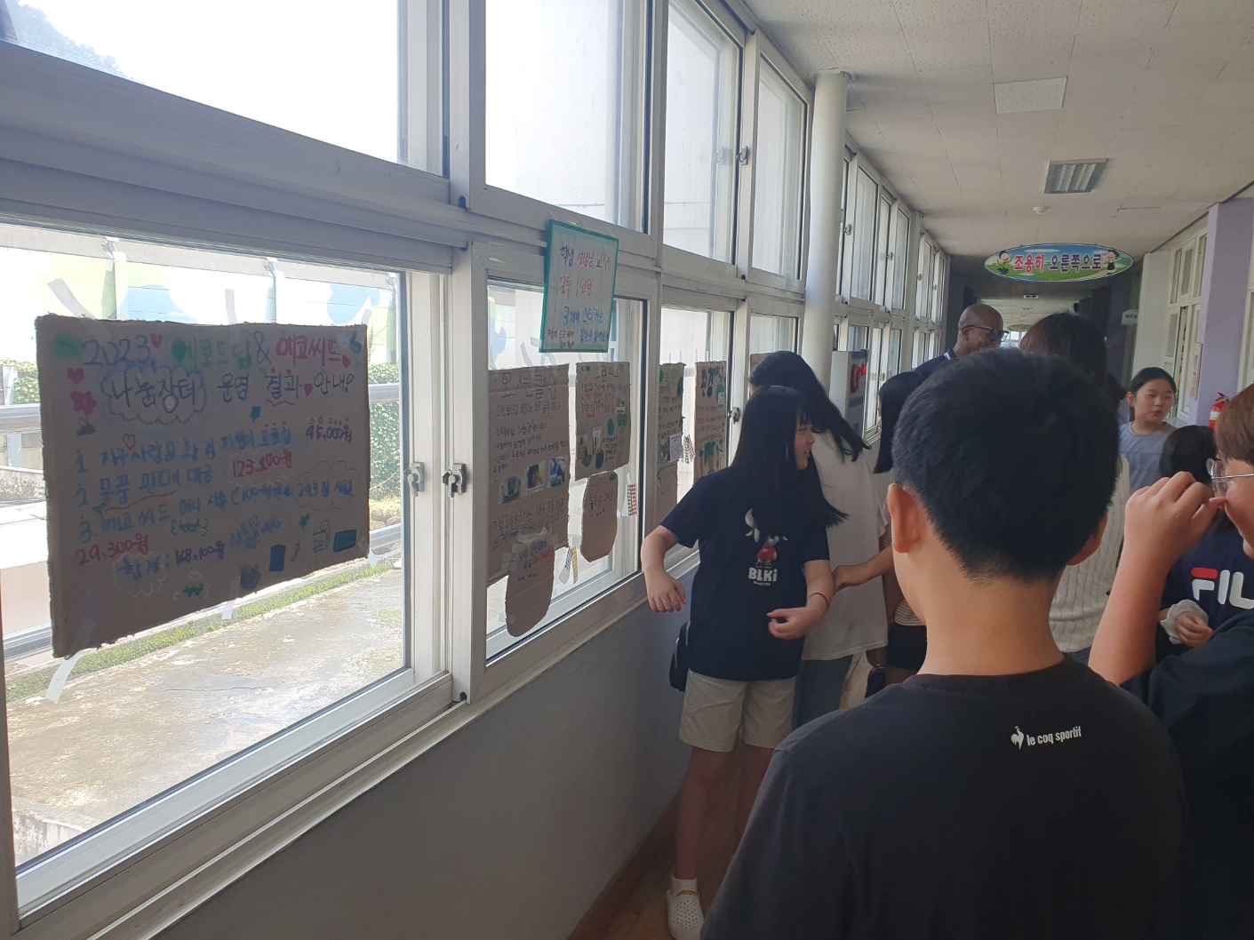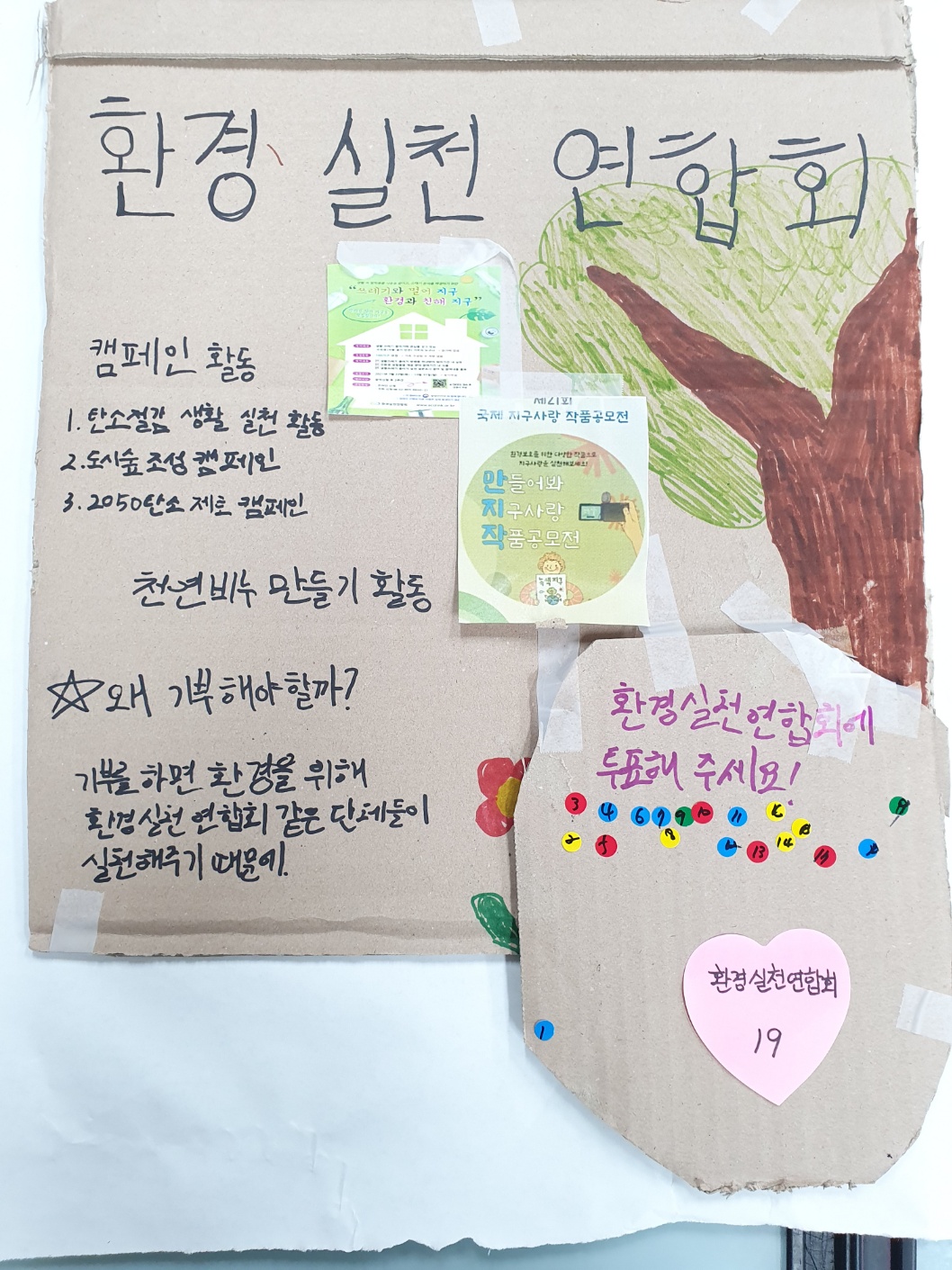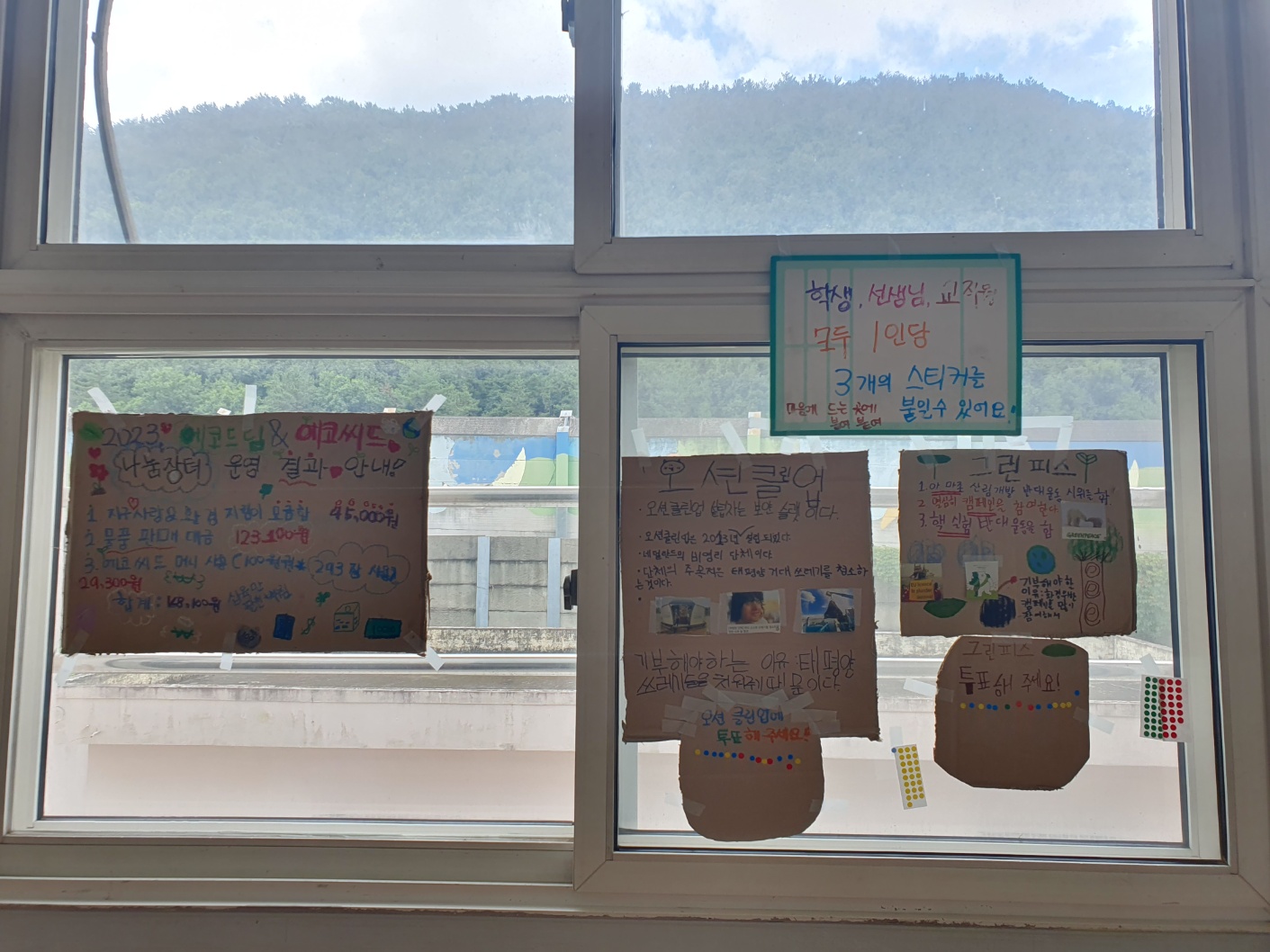 1. 일시:2023. 07.24.(월) ~ 2023.07.25.(화) 2. 장소: 교무실 앞 복도 창문 게시판 3. 참가자: 전교생 4. 활동 내용: -2023.07.21.에 했던 에코씨드 나눔장터의 수익금을 기부할 환경 단체를 정하기 위한 전교생 투표를 실시했습니다. 학생 1명당 총 3개까지 스티커로 의견을 표현했답니다. 각 기부처 후보에 해당되는 환경 단체는 6학년 기후천사단의 조사와 투표로 선정했고 각 후보 환경단체에 대한 자료도 폐지 박스를 활용해서 만들어 게시했습니다.
