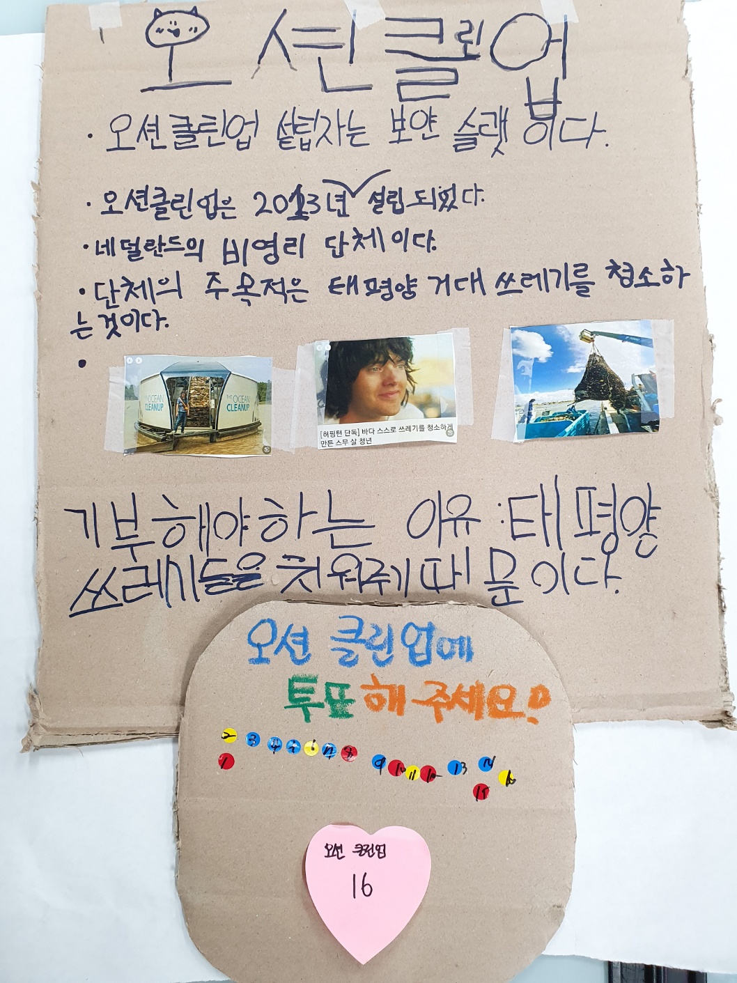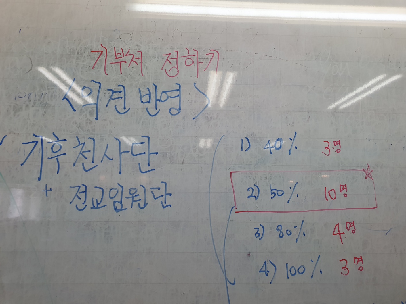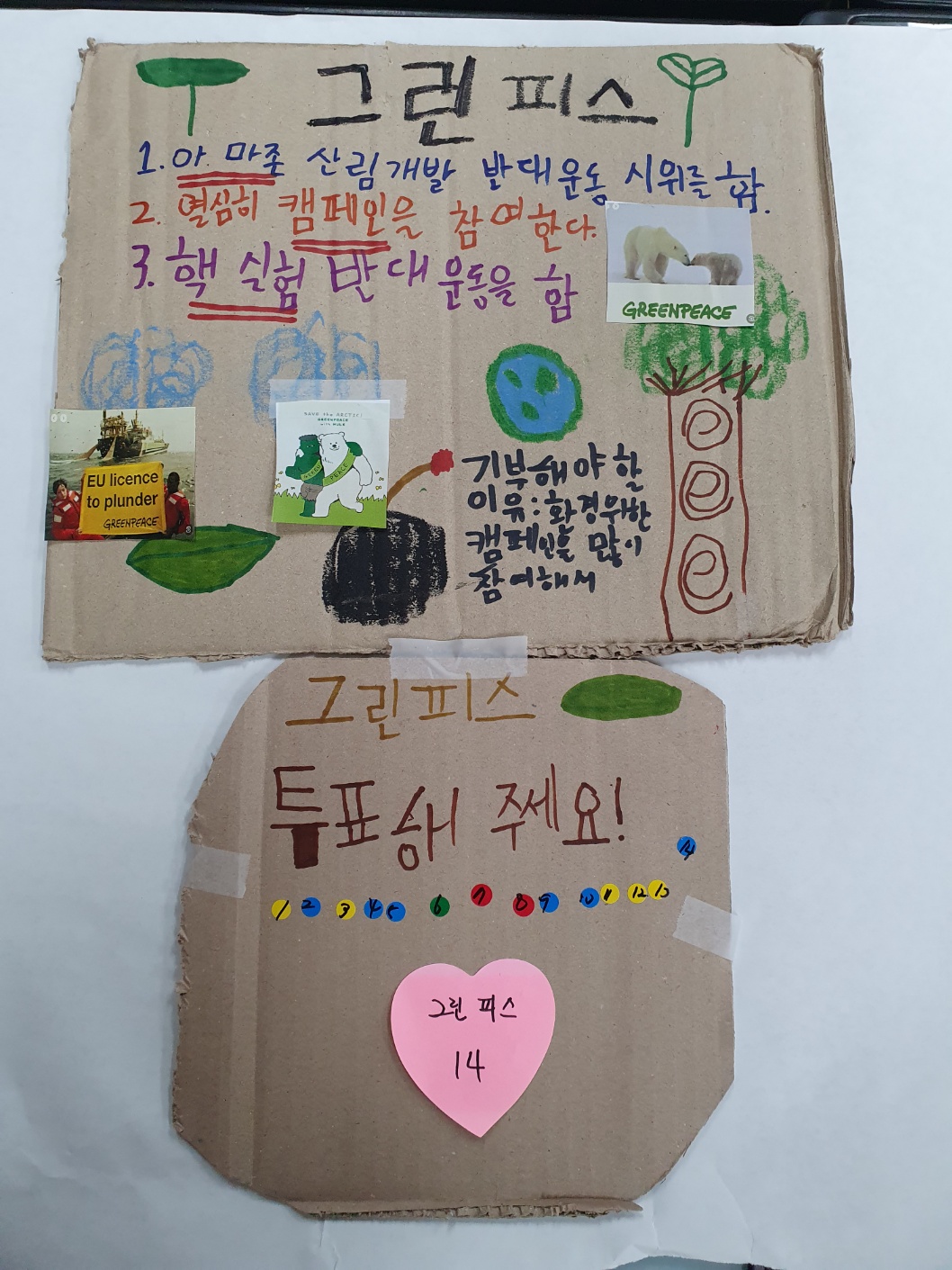 1. 일시:2023. 07.24.(월) ~ 2023.07.25.(화) 2. 장소: 교무실 앞 복도 창문 게시판 3. 참가자: 전교생 4. 활동 내용: -2023.07.21.에 했던 에코씨드 나눔장터의 수익금을 기부할 환경 단체를 정하기 위한 전교생 투표를 실시했습니다. 학생 1명당 총 3개까지 스티커로 의견을 표현했답니다. 각 기부처 후보에 해당되는 환경 단체는 6학년 기후천사단의 조사와 투표로 선정했고 각 후보 환경단체에 대한 자료도 폐지 박스를 활용해서 만들어 게시했습니다.