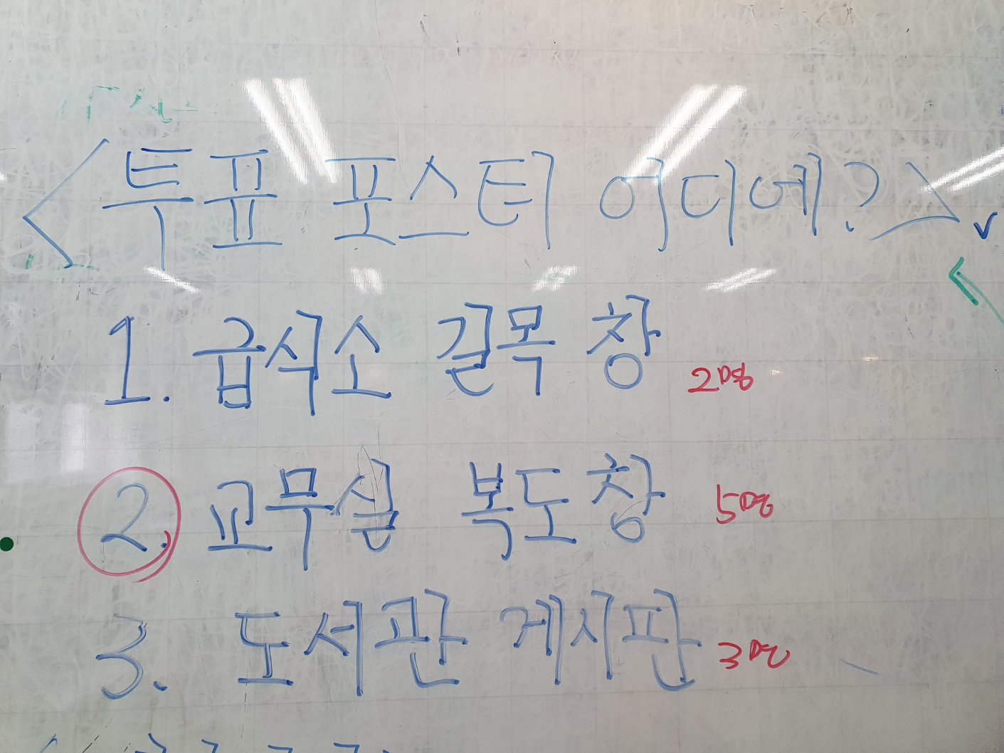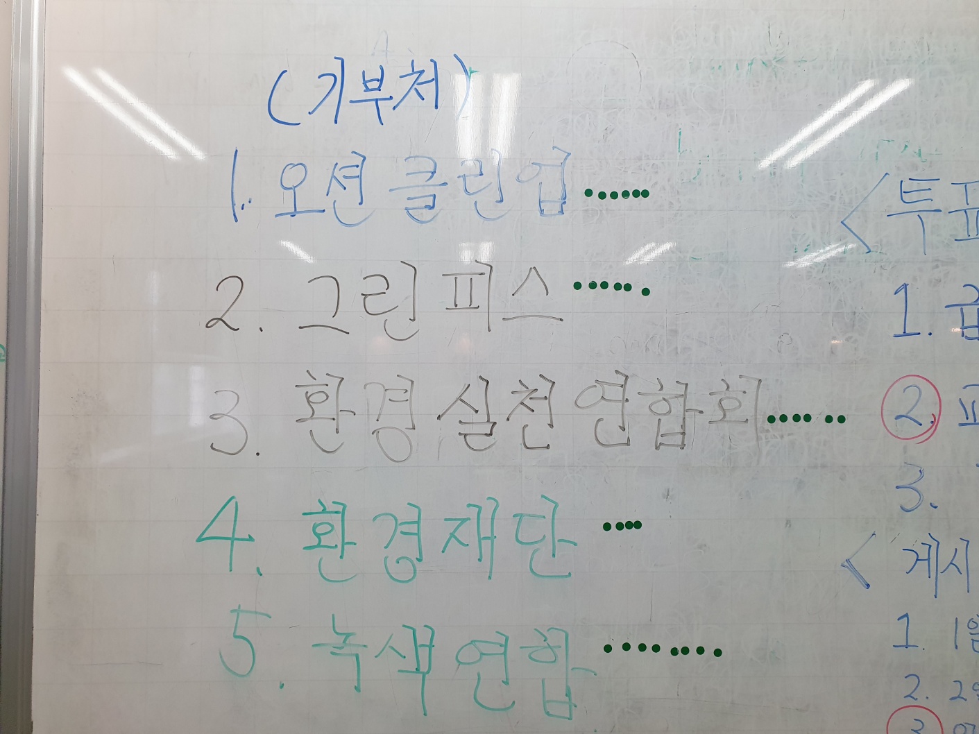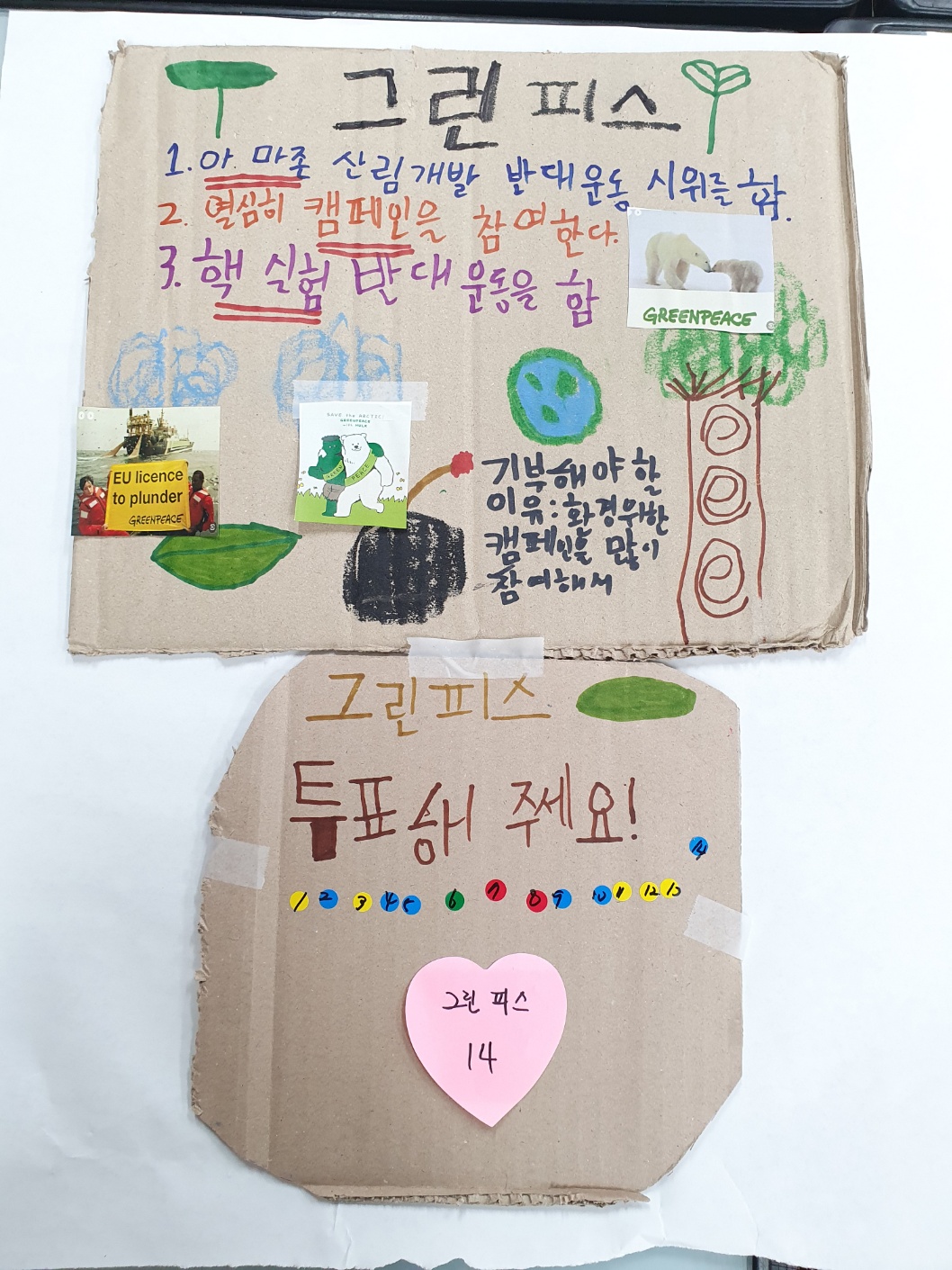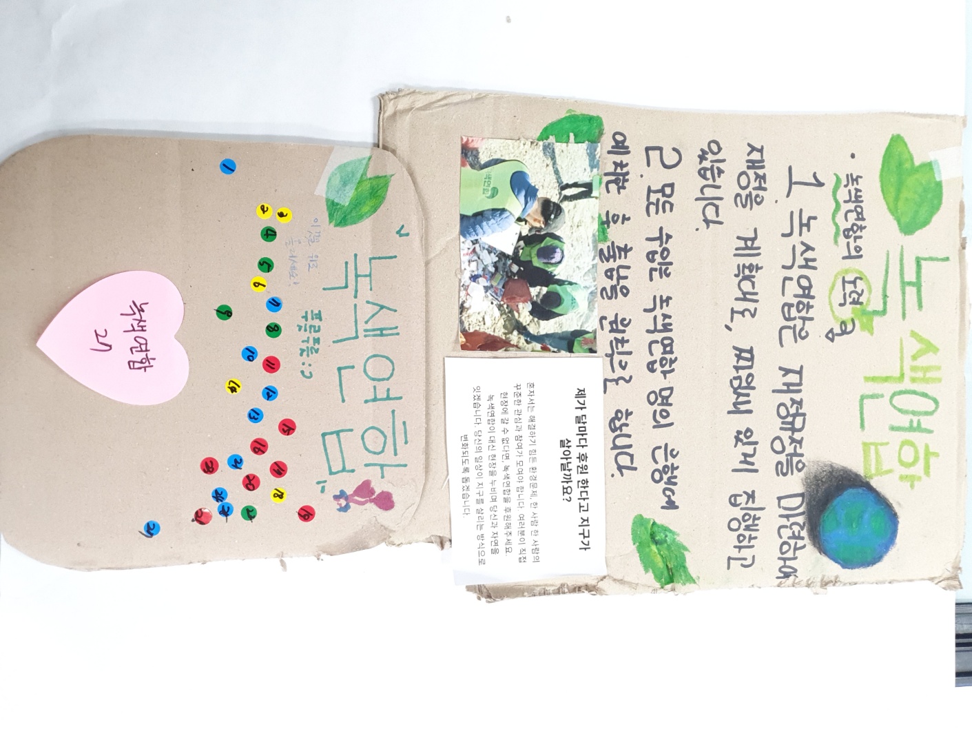 1. 일시:2023. 07.24.(월) ~ 2023.07.25.(화) 2. 장소: 교무실 앞 복도 창문 게시판 3. 참가자: 전교생 4. 활동 내용: -2023.07.21.에 했던 에코씨드 나눔장터의 수익금을 기부할 환경 단체를 정하기 위한 전교생 투표를 실시했습니다. 학생 1명당 총 3개까지 스티커로 의견을 표현했답니다. 각 기부처 후보에 해당되는 환경 단체는 6학년 기후천사단의 조사와 투표로 선정했고 각 후보 환경단체에 대한 자료도 폐지 박스를 활용해서 만들어 게시했습니다.