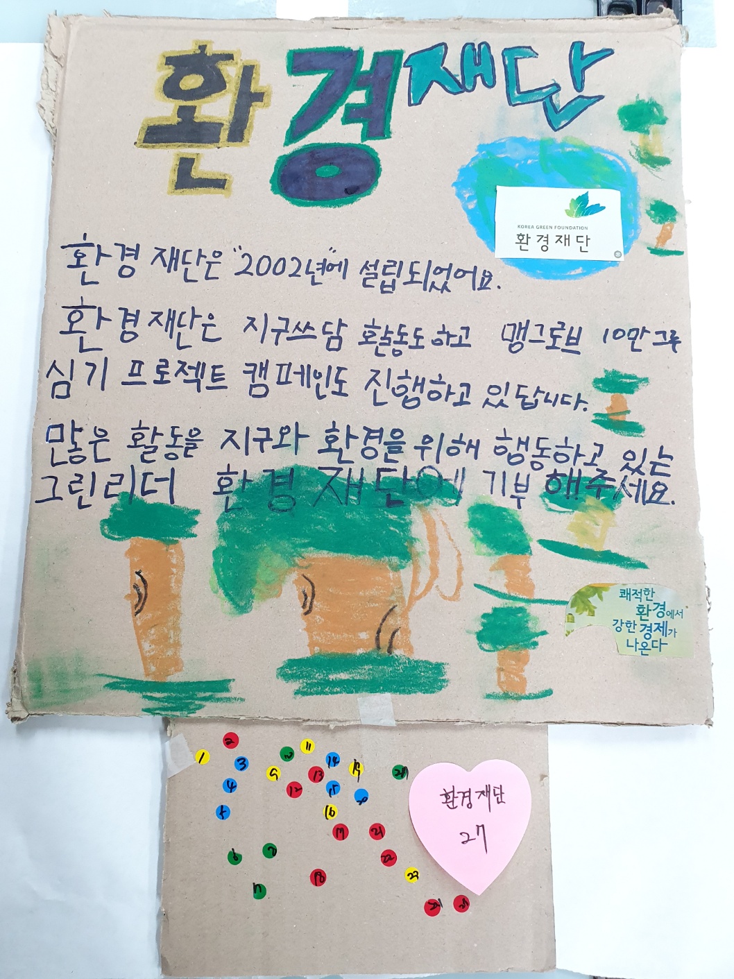 최종 선정된 기부 환경 단체는 (국내) 녹색연합(마산 지부) 56,050원 (국내) 환경재단(전국 지부) 56,050원 (국내) 환경실천연합회 56,000원으로 선정되었습니다.