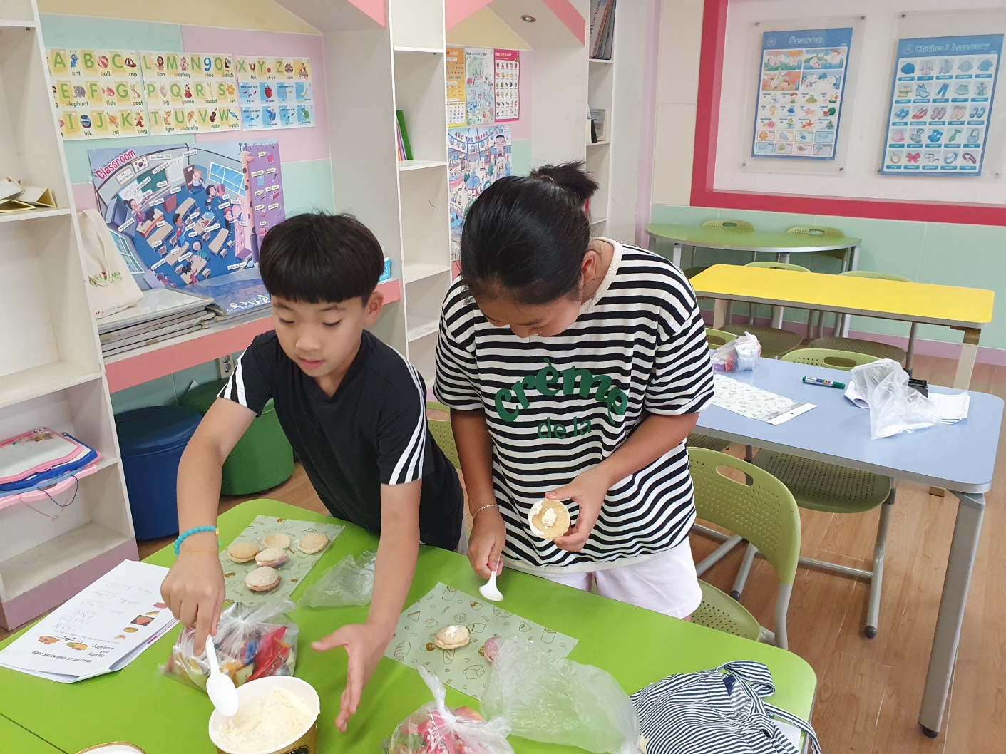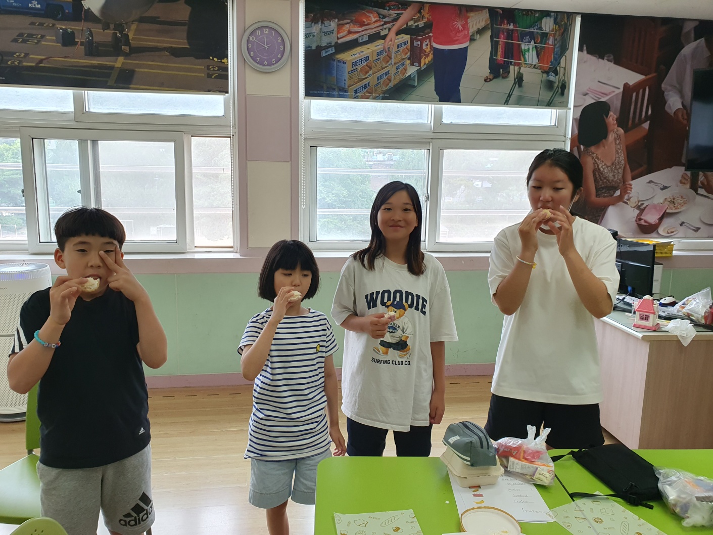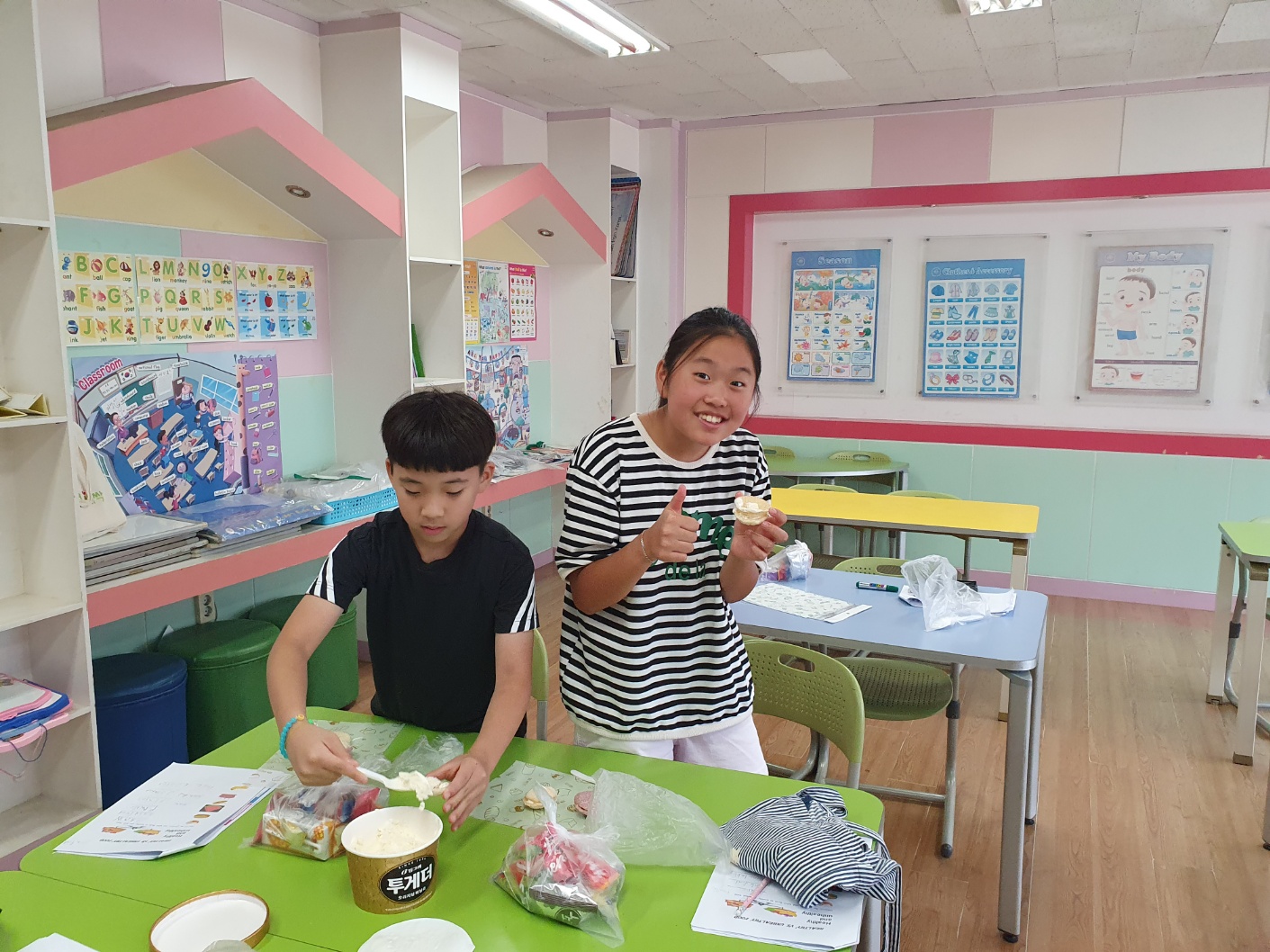 1. 기간: 2023.08.16.(수) ~2023.08.18.(금) 3일간 2. 장소: 과학실 및 영어학습실 3. 참여자: 5~6학년 학생 중 희망학생 4. 활동 내용: - 우리의 건강한 몸을 유지하기 위해 필요한 6대 영양소를 영어 단어로 알아보기 - 각 영양소가 들어있는 대표적인 건강 식품(음식) 단어 알아보기 - 워크북을 활용해서 내가 좋아하는 음식이 건강한 음식인지 건강하지 않은 음식인지 구분해보기 - 건강한 생활을 위해 필요한 음식과 영양소 단어 퍼즐 풀기 - 건강한 여름을 위한 건강 간식 만들기(라이스 칩 샌드위치 아이스크림) - 친구들에게 건강한 음식과 간식 권유해 주고 내가 만든 건강 간식 먹기 - 여름방학 영어 캠프 소감 나누기
