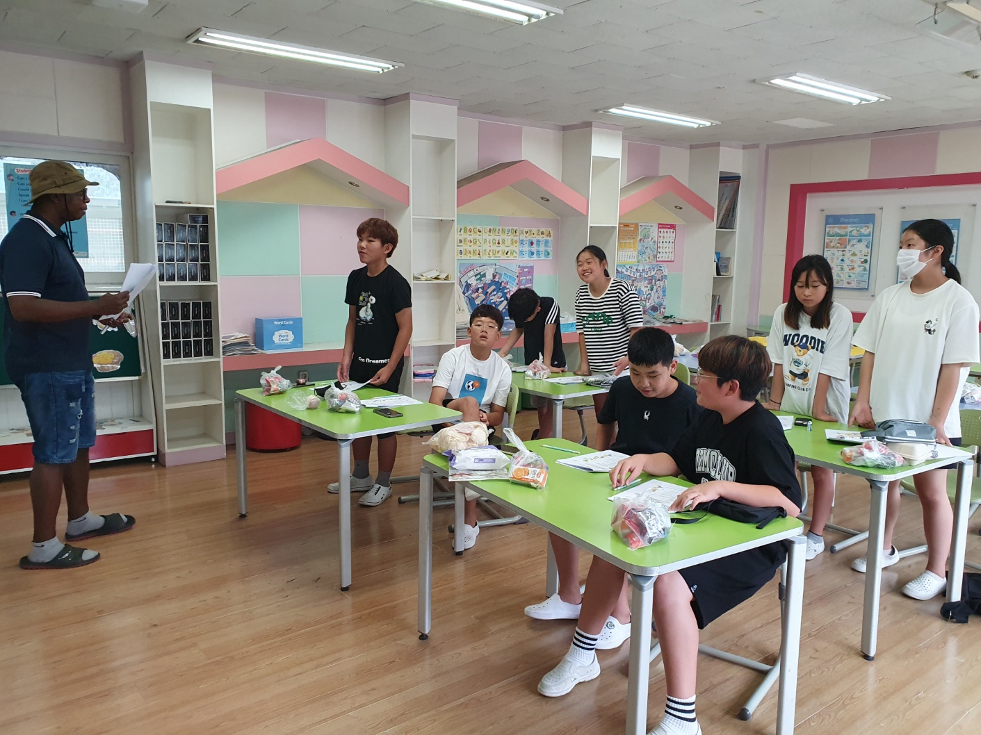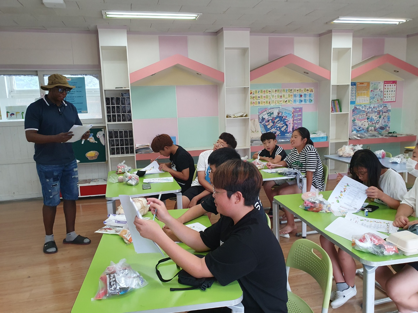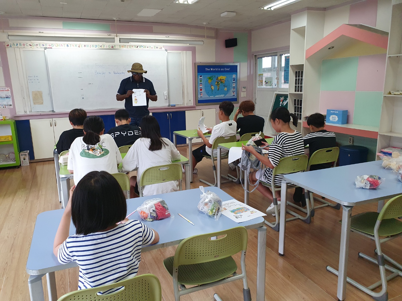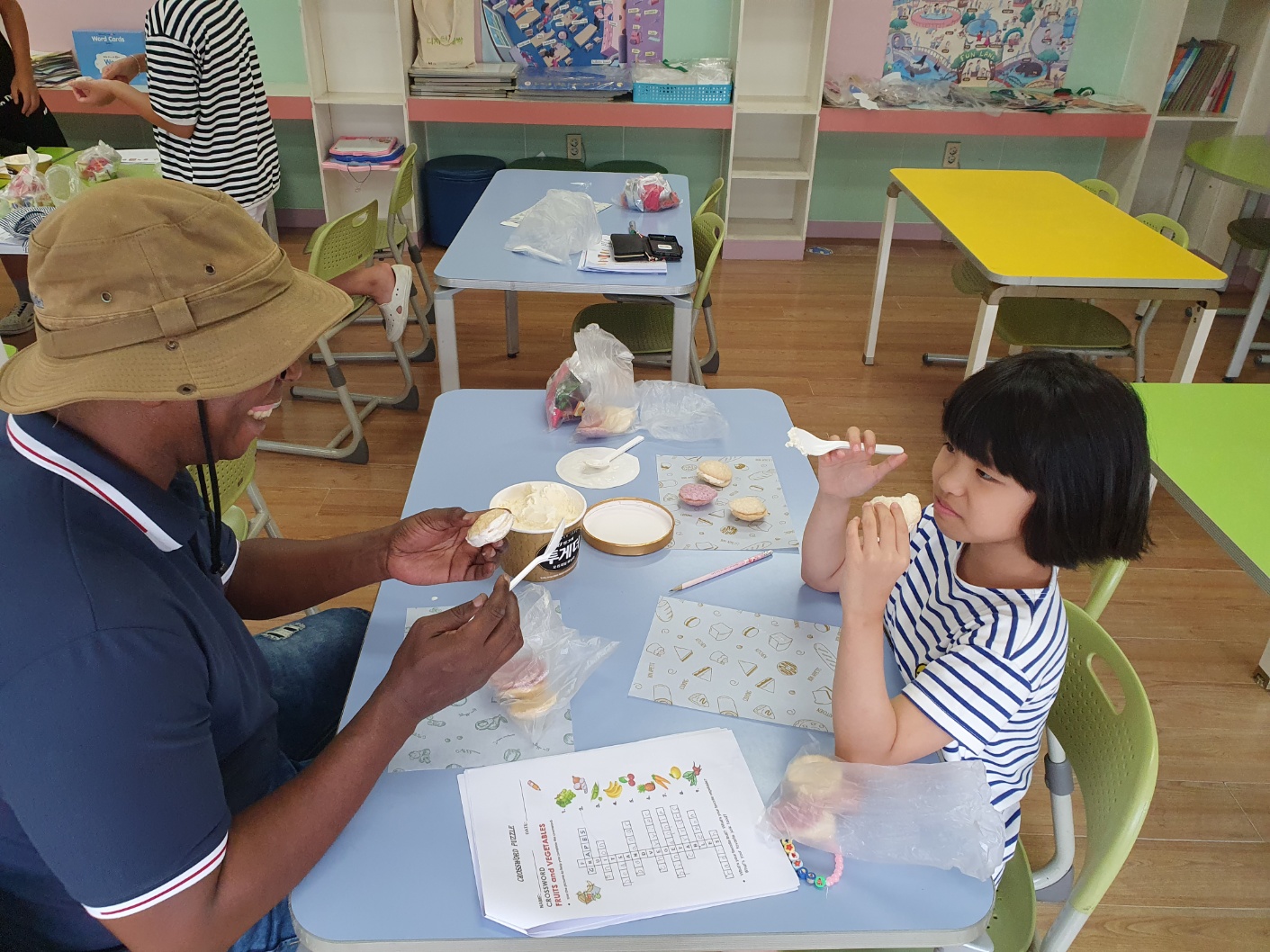 1. 기간: 2023.08.16.(수) ~2023.08.18.(금) 3일간 2. 장소: 과학실 및 영어학습실 3. 참여자: 5~6학년 학생 중 희망학생 4. 활동 내용: - 우리의 건강한 몸을 유지하기 위해 필요한 6대 영양소를 영어 단어로 알아보기 - 각 영양소가 들어있는 대표적인 건강 식품(음식) 단어 알아보기 - 워크북을 활용해서 내가 좋아하는 음식이 건강한 음식인지 건강하지 않은 음식인지 구분해보기 - 건강한 생활을 위해 필요한 음식과 영양소 단어 퍼즐 풀기 - 건강한 여름을 위한 건강 간식 만들기(라이스 칩 샌드위치 아이스크림) - 친구들에게 건강한 음식과 간식 권유해 주고 내가 만든 건강 간식 먹기 - 여름방학 영어 캠프 소감 나누기