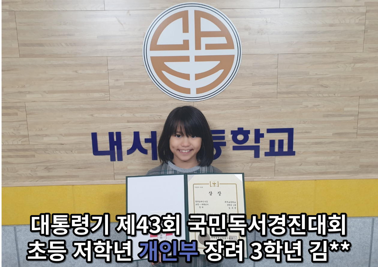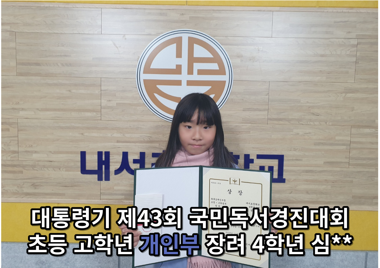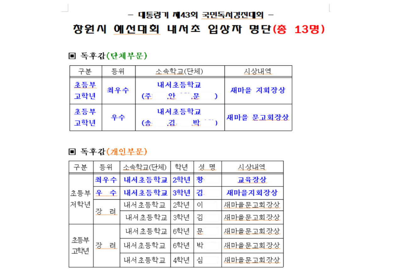개인부 저학년 장려 이**, 김**, 개인부 고학년 장려 문** 박** 심** 총 13명의 우수한 성적을 거두어 시상식을 시행했습니다. 열심히 책을 읽고 독후감을 써준 내서초 모든 학생들에게 큰 박수와 칭찬을 보냅니다.