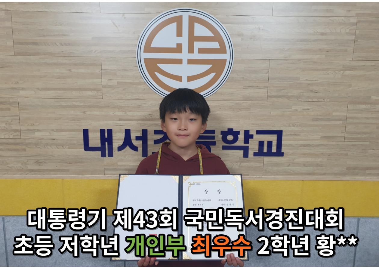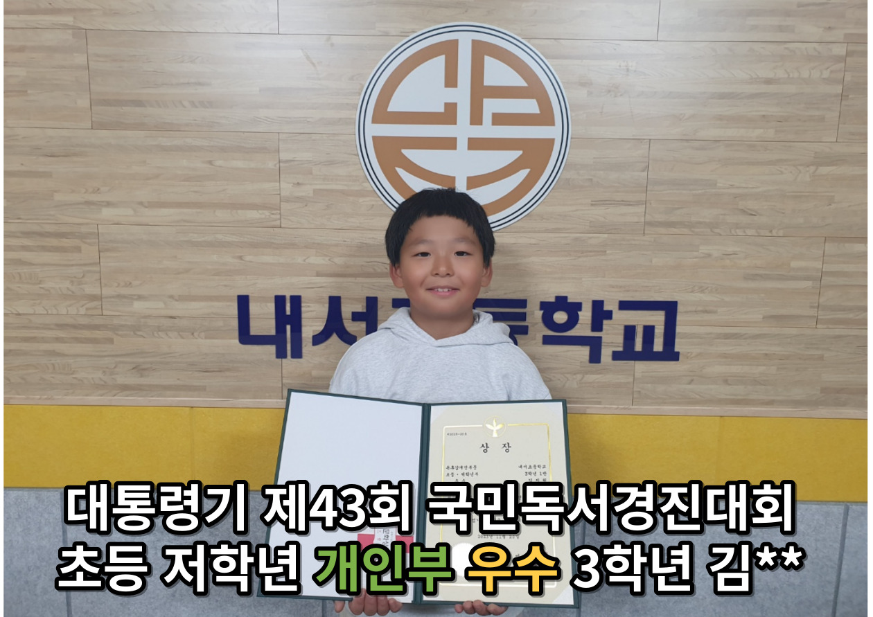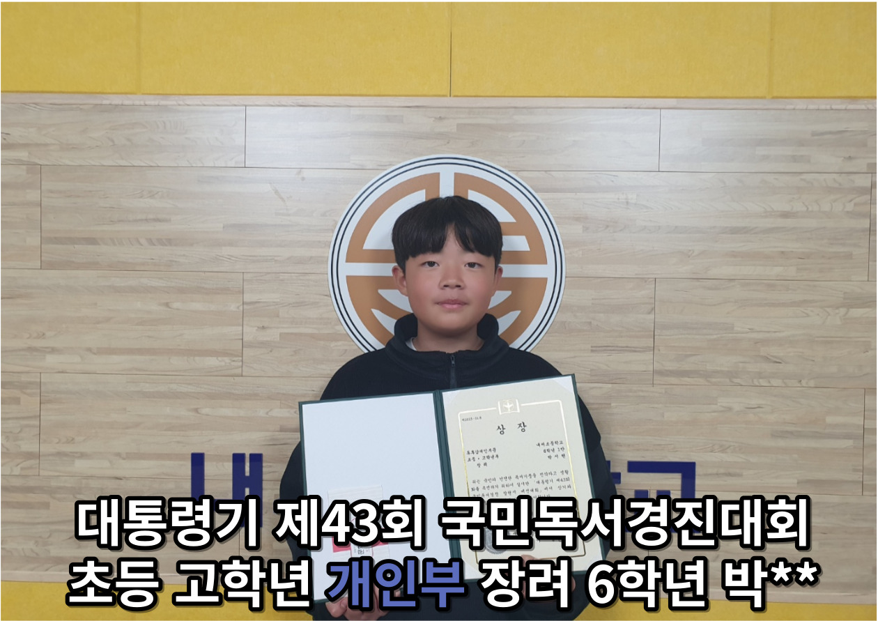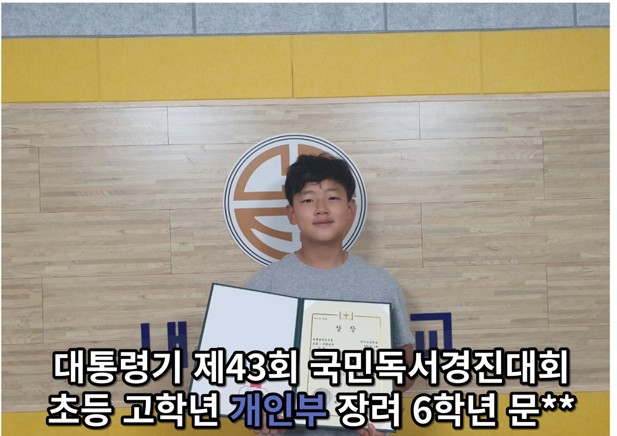 개인부 저학년 장려 이**, 김**, 개인부 고학년 장려 문** 박** 심** 총 13명의 우수한 성적을 거두어 시상식을 시행했습니다. 열심히 책을 읽고 독후감을 써준 내서초 모든 학생들에게 큰 박수와 칭찬을 보냅니다.