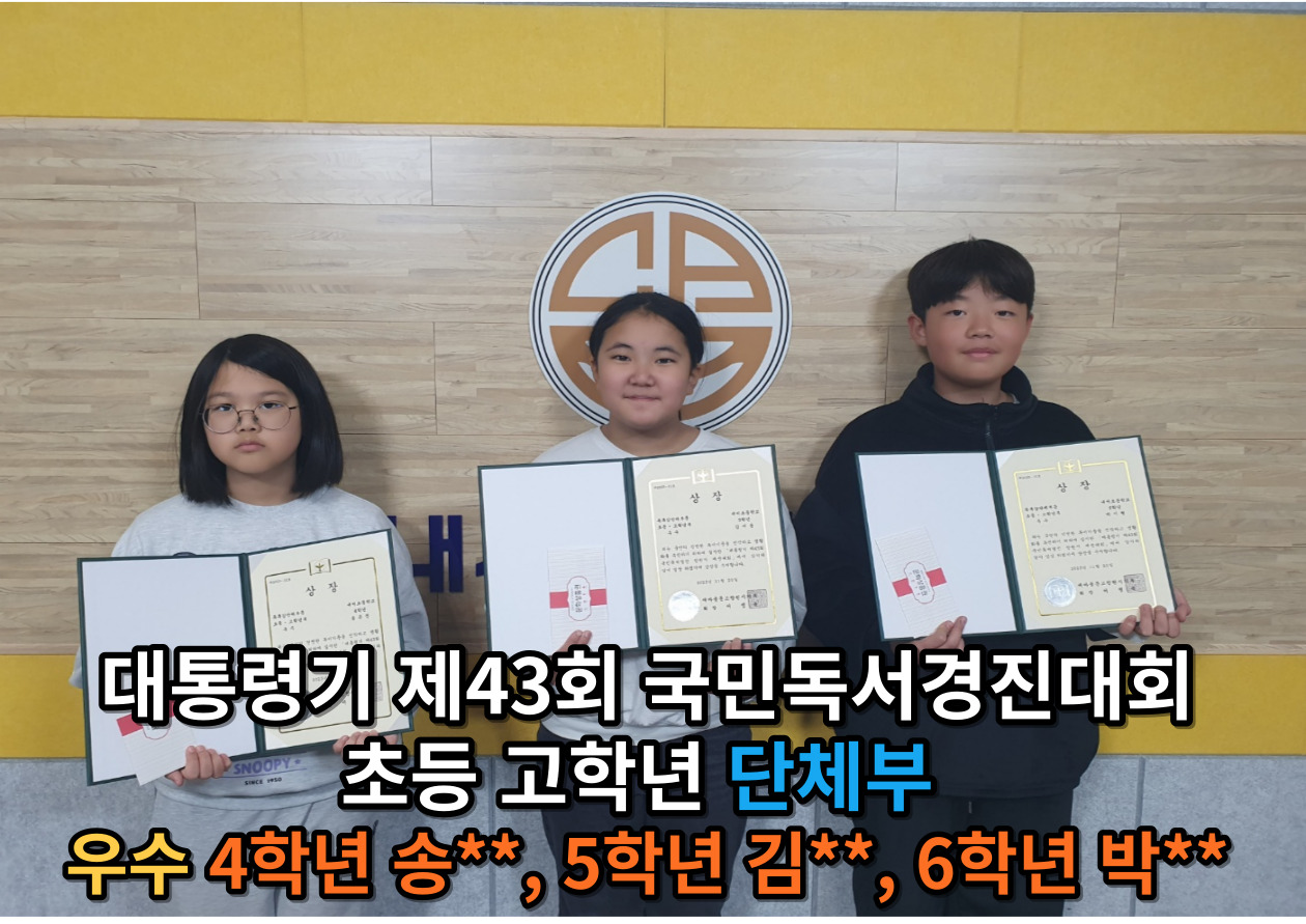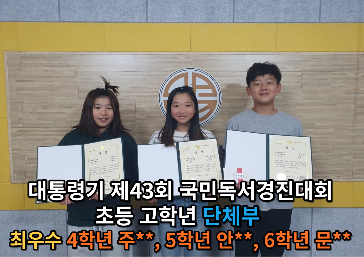 1. 일시: 2023.12.01.(금) 아침 방송 조회 2. 장소: 방송실 및 각 교실 3. 참가자: 황**외 12명(개인부 7명, 단체부 6명-2팀) 4. 활동 내용: -대통령기 제43회 국민독서경진대회 독후감 부문에서 개인부 저학년 최우수 황**, 우수 김** 단체부 고학년 최우수 주**, 안**, 문** 단체부 고학년 우수 송**, 김**, 박**