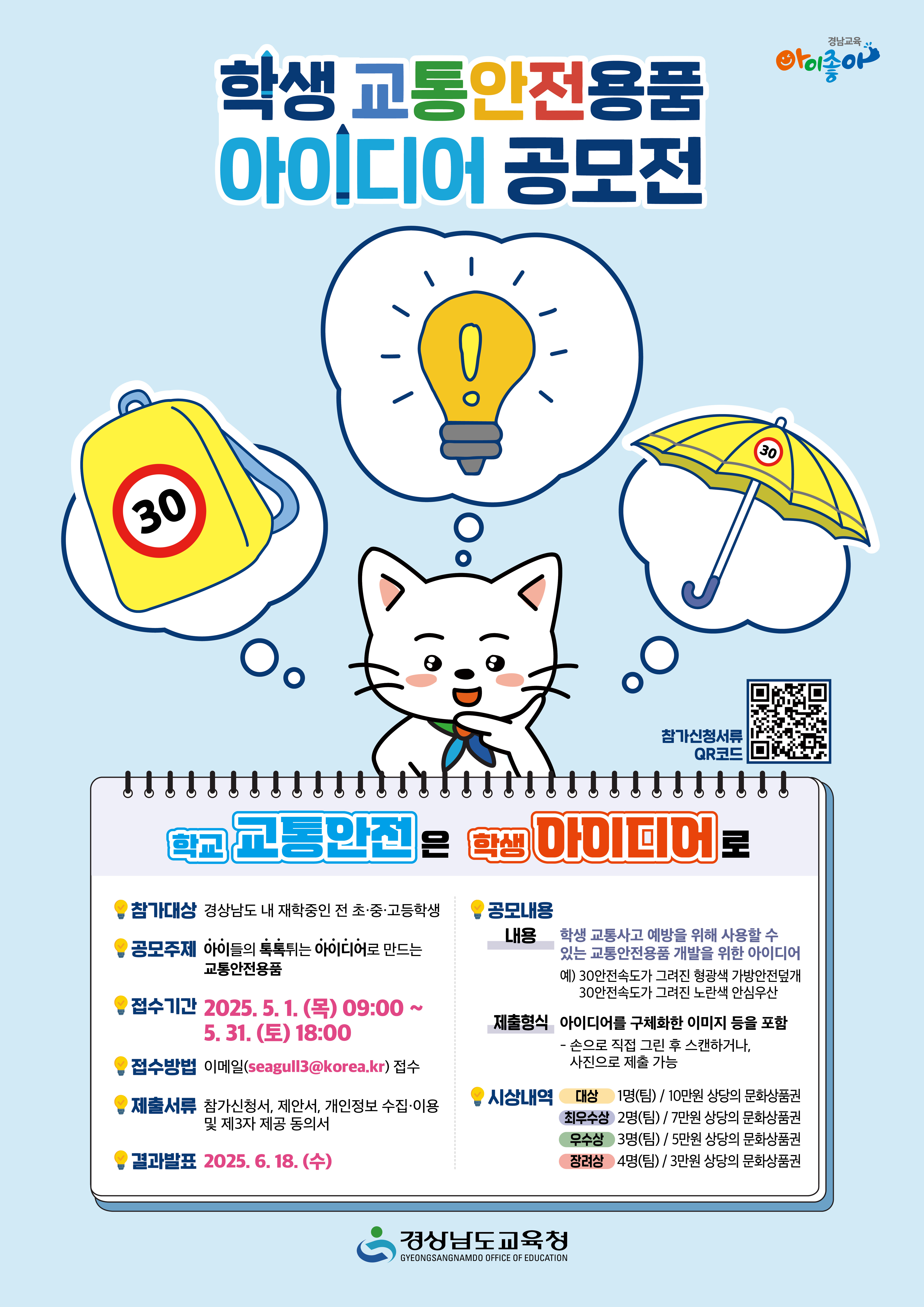 가. 공모전 명칭: 학생 교통안전용품 아이디어 공모전 나. 참가대상: 전 초ㆍ중ㆍ고등학생(개인 및 단체) 다. 공모주제: 아이들의 톡톡튀는 아이디어로 만드는 교통안전용품 라. 접수기간: 2025. 5. 1.(목) 09:00 ~ 5. 31.(토) 18:00 마. 접수방법: 이메일(seagull3@korea.kr) 접수 바. 시상내역: 대상 1명(팀), 최우수상 2명(팀), 우수상 5명(팀), 장려상 7명(팀) 사. 세부운영계획: 공모전 공모요강 참고(붙임 파일)